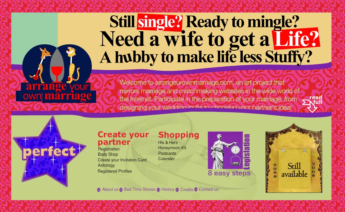 Archana Hande, trained as a printmaker from Santiniketan, practices in various medium. Known for her tongue-in-cheek humour, her works comment on social behavior of the current times. One of her projects, http://www.arrangeurownmarriage.com/, is a take on arranged marriages in India. The project was eight years in the making and was activated on the world wide web in 2008. The idea of the project was seeded in 2002 during the Gujarat riots. The discussion around identity, purity of race and secularism were the starting point of the project [4]. Taking a cue from the booming business of matrimonial sites in India, arrangeurownmarriage.com became a satire on the tradition of arranged marriage.