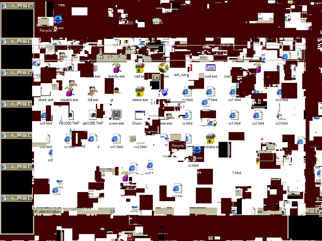 Subbaiah did a few flash based projects, but his interest was in creating pseudo virus programs. He made Crash Run (2001-02) using existing programs. Like a 1990s mixed tape, he created a few programs as one compilation which when played would wreck havoc on the screen of the user. This program automatically deteriorated the screen. The computer seemed to crash uncontrollably. But it was just a simulation of the crash provided by the program, the system was otherwise secure. The program had to be uninstalled to be able to use the computer normally. This program can be downloaded from Rhizome and Subbaiah’s website. The latter does not exits since the shutting down of geocities. One can still run the program on the Windows 98 OS.