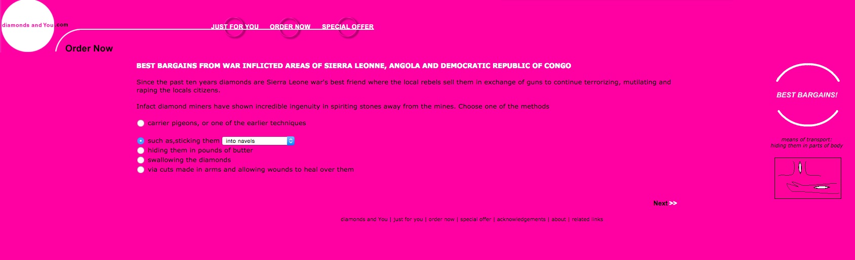 Diamonds and You gets the attention of the audience by sale offers on diamonds. It is only mid-way in the process that the audience realises that the website has a larger point. The steps in the online process enables the transformation of the audience into participant. Uniting acts of interaction and performance, the artist creates acts of subversion. There is a dislocation of the role of a consumer when the participants decide the kind of diamond they want only to discover the political and economical effects of their choice. The work exists in collaboration with the audience/participant. The experience of interacting with the website creates the work. “Like Andy Warhol’s factory, the people as well as the methods of production and distribution were all part of the project’s meanings” [4]. While the elements exist in terms of hyperlinks and meta data, the cohesiveness of the website is created only by interacting with it. The user is the simultaneous creator and the audience, evolving the role with the time spent on the website: