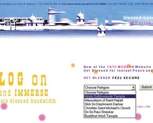Another project, blessed-bandwidth.net, commissioned by Tate Online, gave instant blessings to the visitors of the website. The visitor can choose from five religions – Hinduism, Muslim, Sikhism, Christianity and Buddhism, to receive their blessings. Upon choosing the religion, the website shows the photographs of the places of worship of the chosen religion. Upon clicking the place of worship, warnings signs for covering heads, removing footwear and menstruating women to leave the website, come up. The visitor performs a three step ‘ritual’ to take the blessings before being presented with a verification certificate. The visitor can also keep a diary of sins and dress up a deity as per the chosen religion.